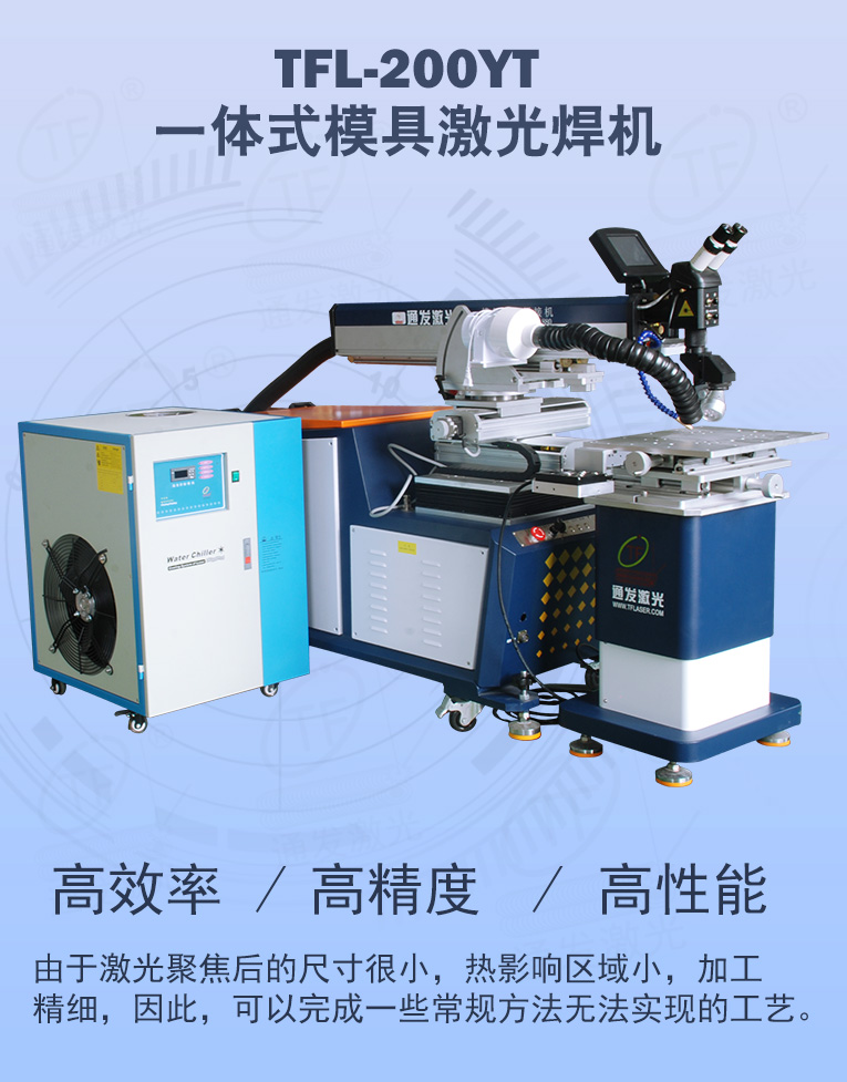 出口型模具激光焊機是通發(fā)激光公司專門為出口國外客戶使用而設計的系列機型TFL-200E,適用于各類精密注塑模具、壓鑄模具等模具激光修補焊接;同時也適合鑄件沙孔激光修補、模具崩缺激光修復、過切加工等的激光修補;各類金屬結(jié)構(gòu)件、金銀首飾的激光焊接加工。